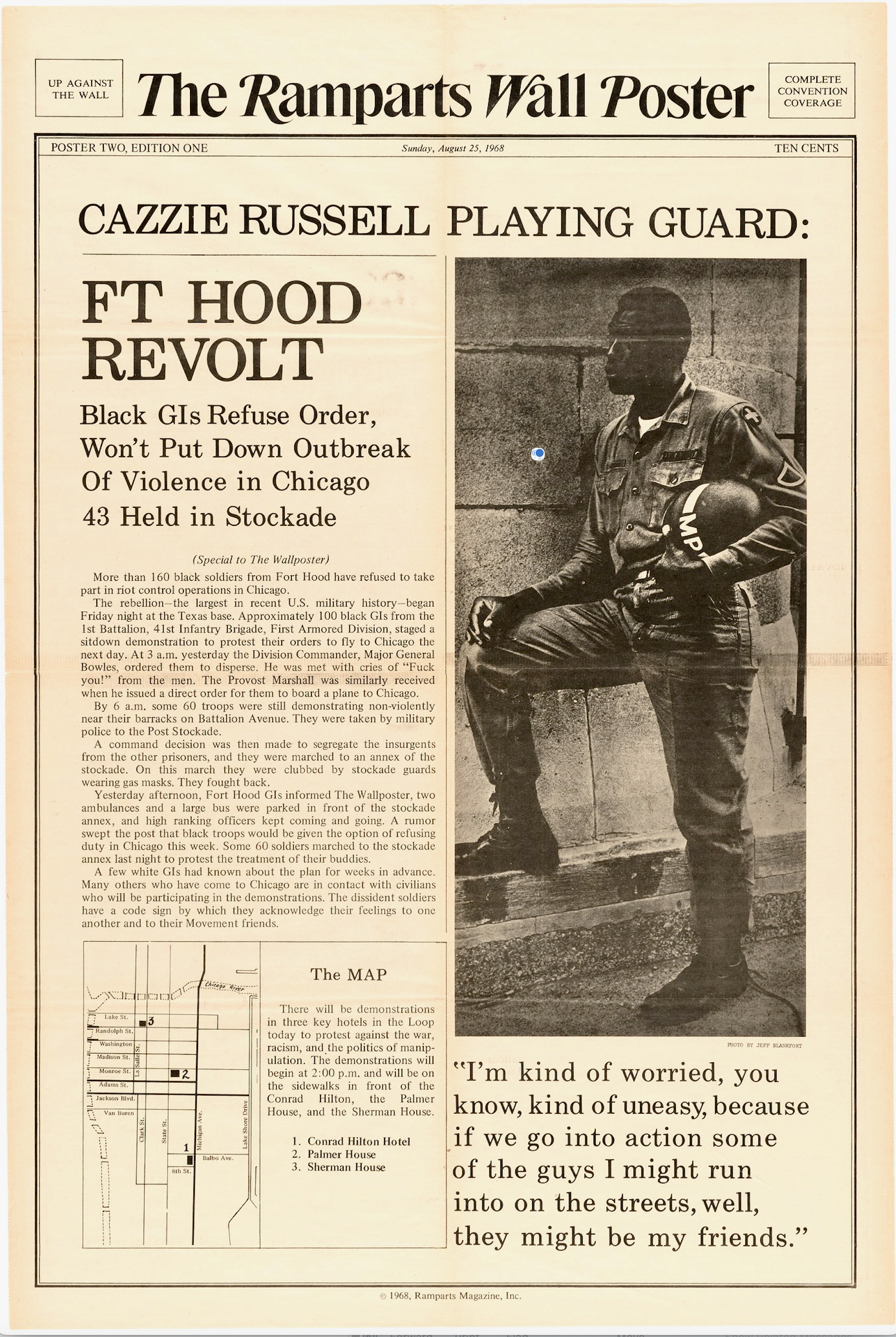 Two MPs patrolling in a jeep soon came by. Although Montgomery had revived, the MP in charge, Clyde Lomax, insisted on driving him to the hospital. There were two hospitals on the base, but Lomax drove to the one furthest away. He would stay away for half an hour, although he knew that serious trouble was brewing between the Blacks and the Italians.